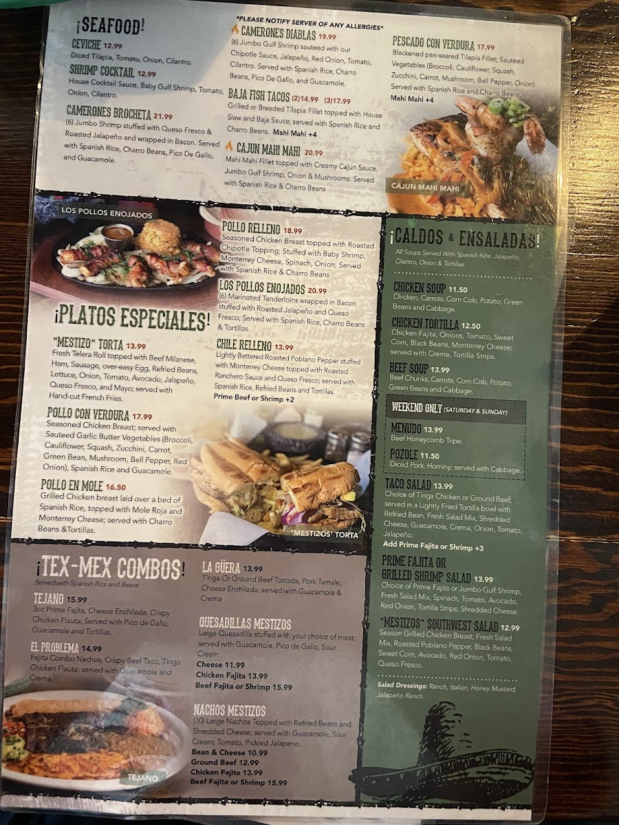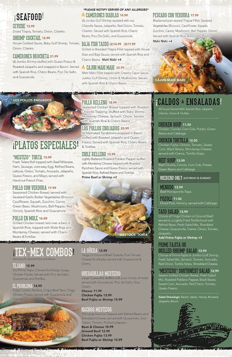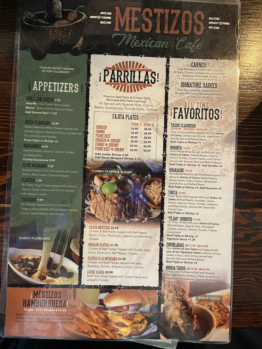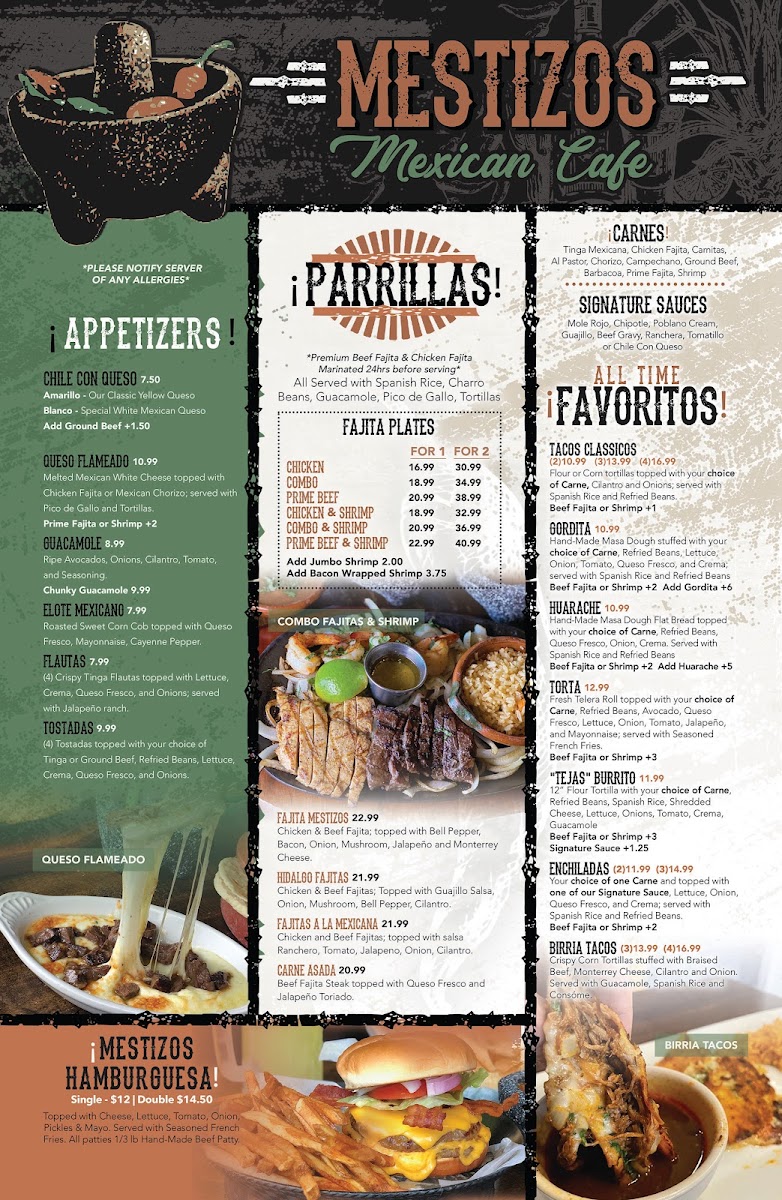 Welcome to Mestizos, where culinary tradition meets modern flair right here in Conroe, TX. Our menu is a vibrant tapestry of flavors that showcases the richness of Mexican cuisine. Start your day with our delightful breakfast offerings; the Tres Leches Pancakes are a standout—fluffy, decadent, and drizzled in a rich sauce, promising an unforgettable taste experience. The Chorizo Breakfast Taco and Spanish-style breakfast bowl are perfect for those craving hearty, robust dishes.